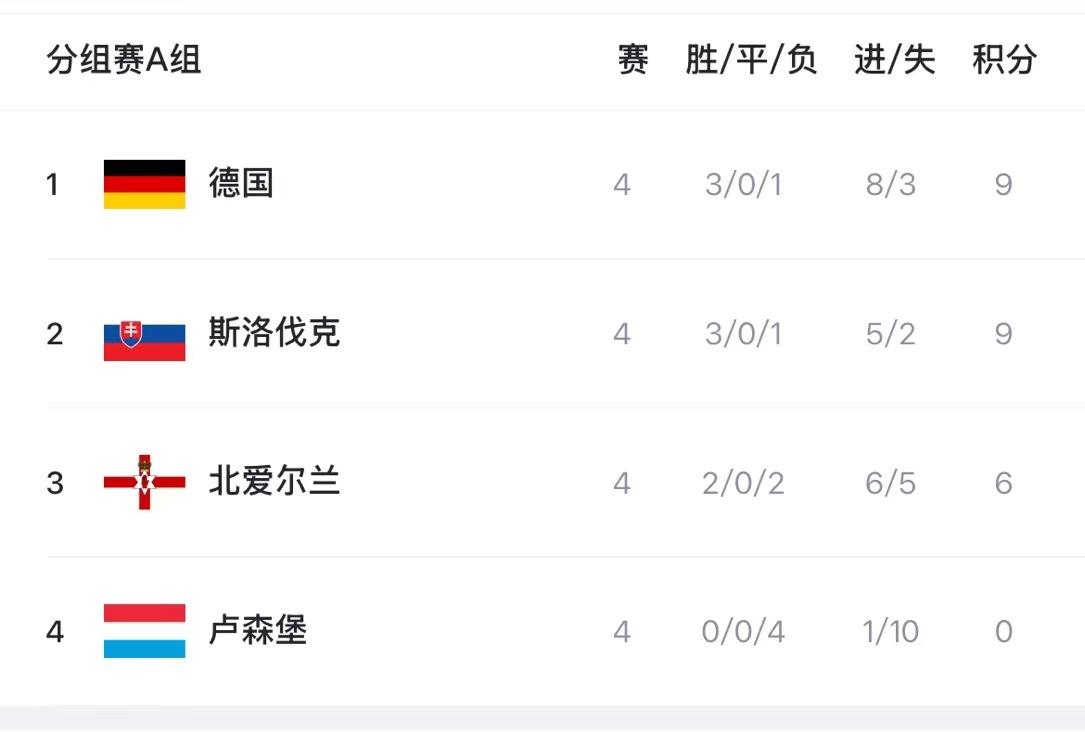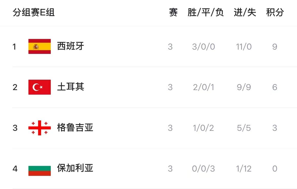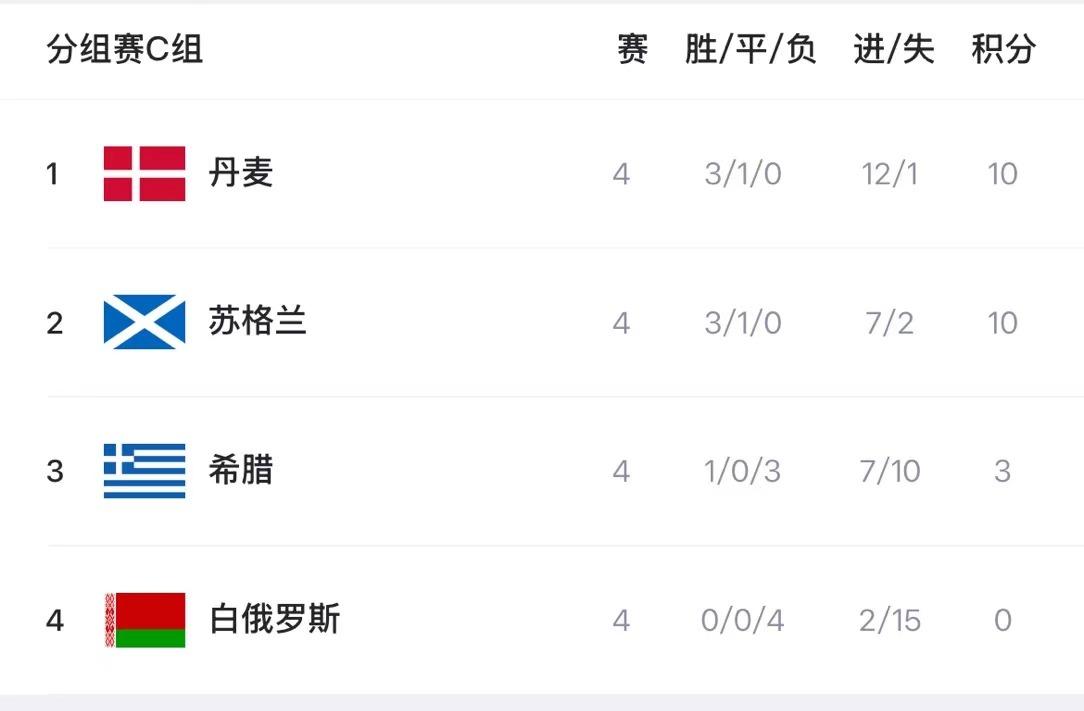 在最新积分榜上,德国、瑞士、丹麦、法国、西班牙、葡萄牙、荷兰、奥地利、挪威、比利时、英格兰、克罗地亚等队领跑各自小组。